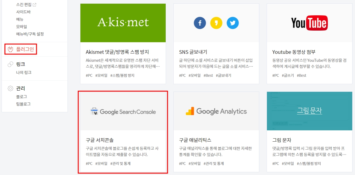 플러그인에 접속하시면 여러 플러그인 중에서 '구글 서치콘솔'을 클릭합니다.