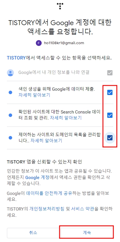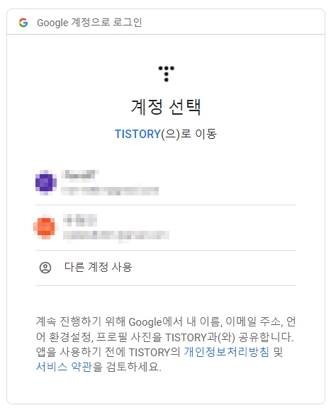 구글 계정을 선택하고, 티스토리에서 구글 계정에 대한 엑세스 요청에 대해 모두 동의하여 주시기 바랍니다.