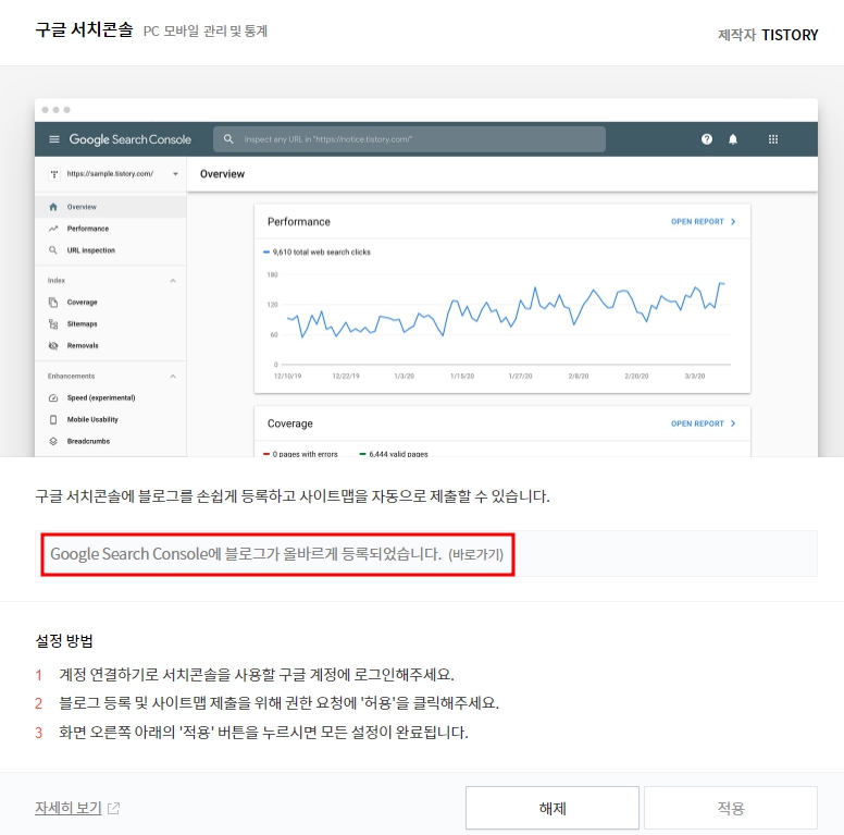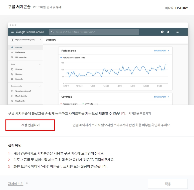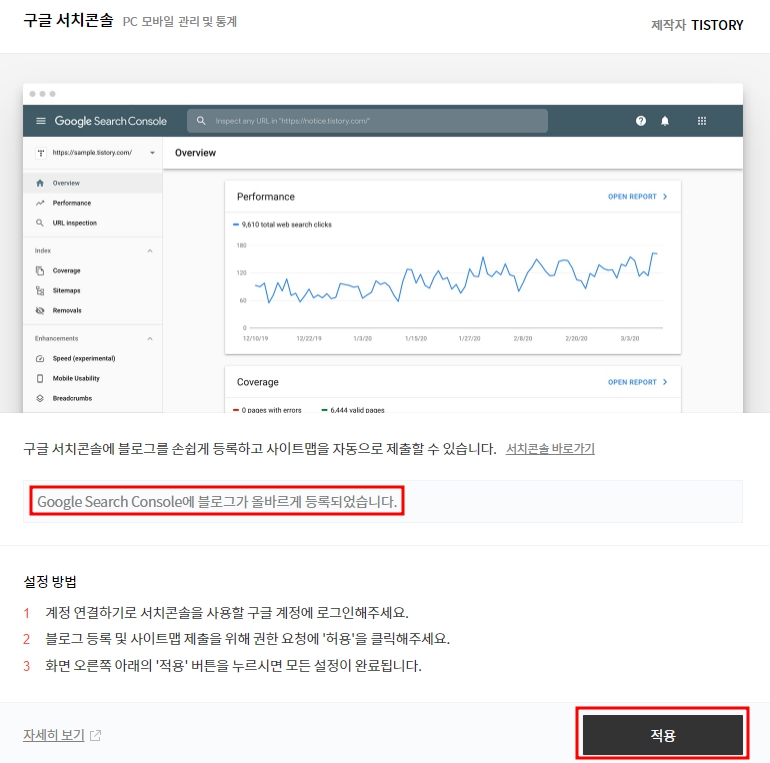 하단에 '적용' 버튼을 꼭 클릭해야 티스토리와 구글 서치콘솔 계정 연결이 완료됩니다.