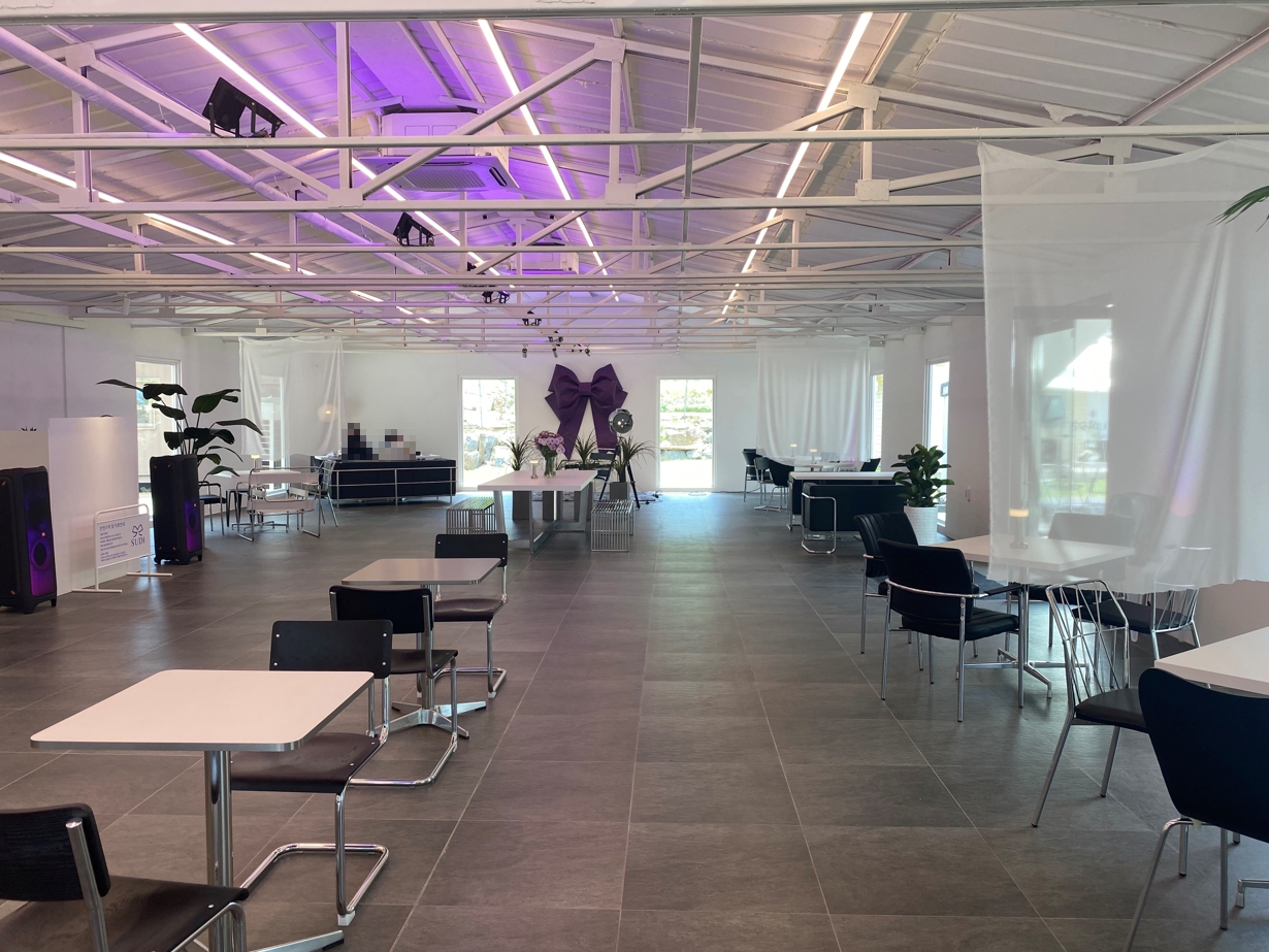 수디 매장 내부는 넓직하게 자리잡은 여러 테이블과 수디매장를 상징하는 보라색 왕리본으로 인테리어 되었습니다.