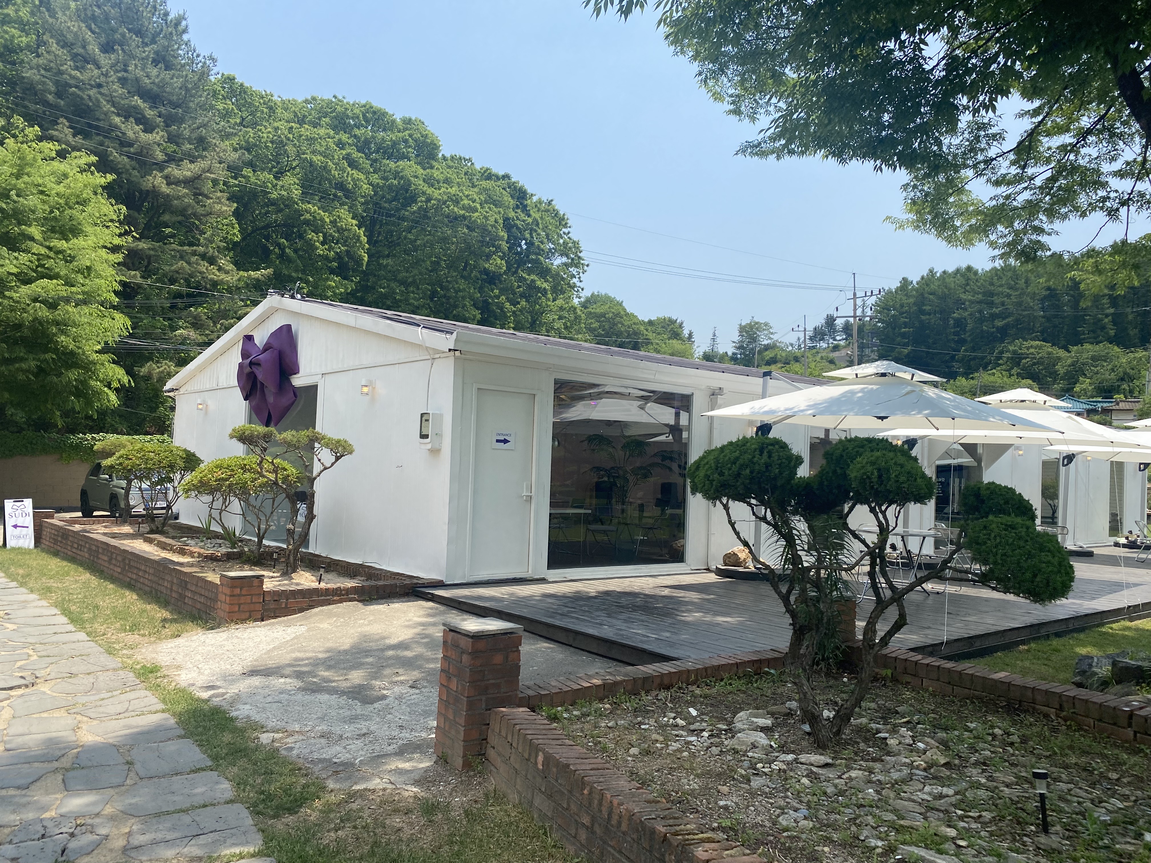야외에는 테라스 테이블이 있으며, 뜨거운 햇빛을 가려줄 수 있는 대형 파라솔이 구비되어 있었습니다.