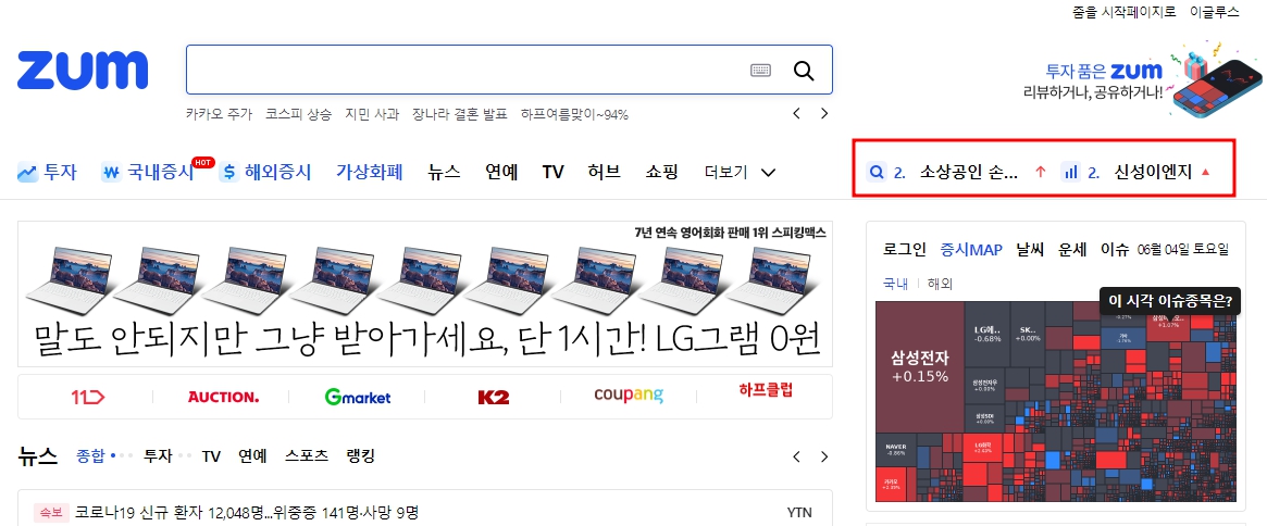 줌 메인 홈페이지에서 실시간 검색어를 확인 가능하며, 검색량이 많은 주식 '주요 종목' 도 확인할 수 있습니다.