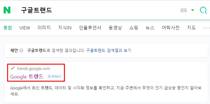 주요 포털사이트에서 '구글트렌드'를 검색하여 홈페이지에 접속합니다.
