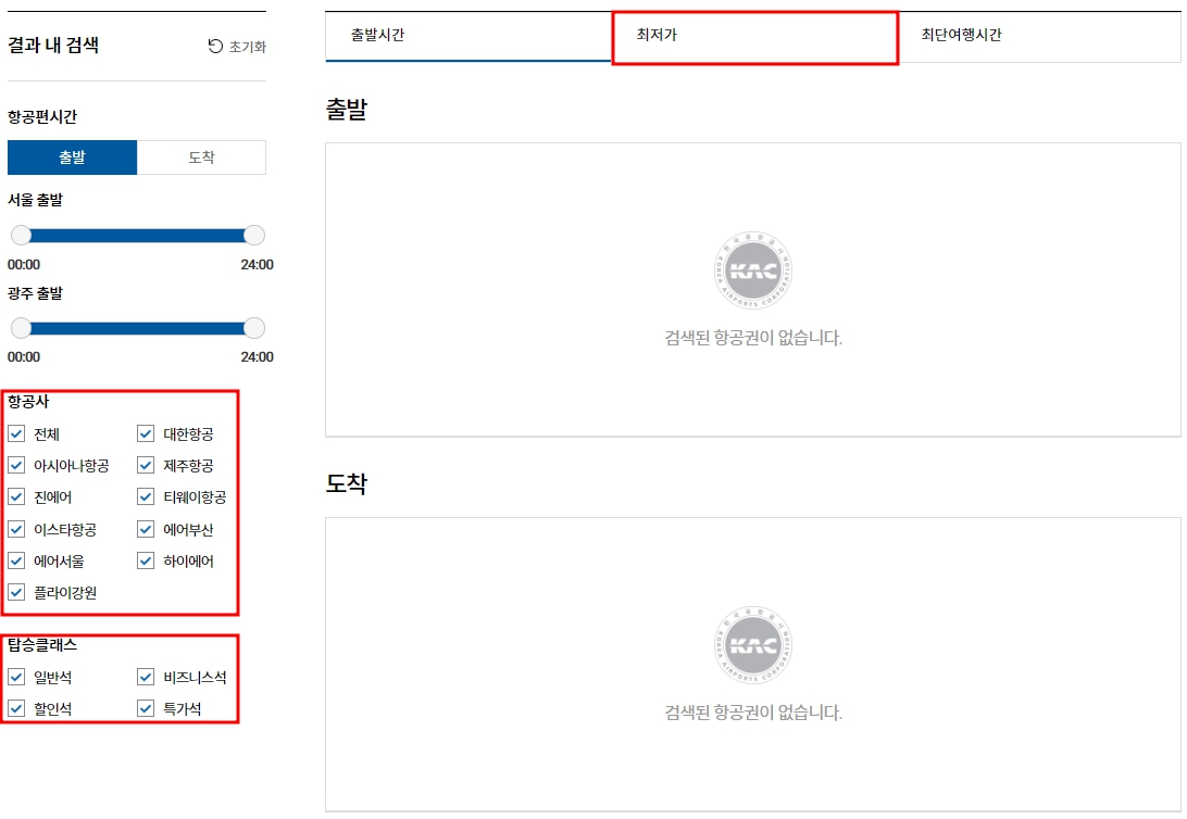 검색 후 최저가 버튼을 클릭하면, 가격이 낮은 순서대로 비행기 표가 정렬됩니다.
