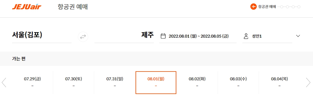제주항공 2022년 8월 1일 김포 -> 제주 항공권 예매 현황입니다.