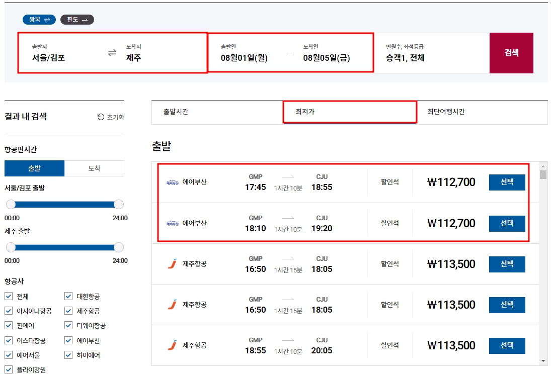 KAC한국관광공사에서 확인한 8월 1일 제주도 항공권을 통해 비행기 예매 가격 차이에 대해 알아보겠습니다.