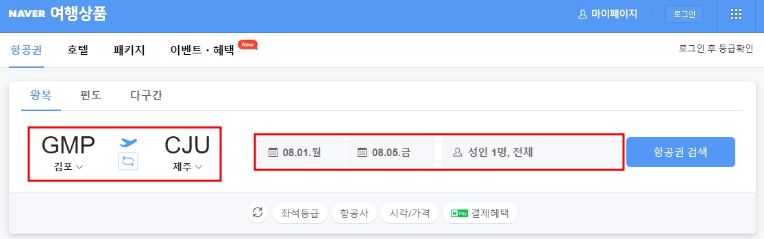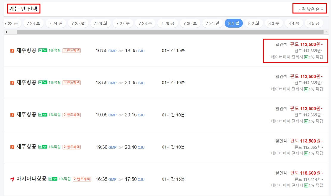 예시로) 2022년 8월 1일 출발 비행기를 네이버 비행기 예약과 비교를 해보았습니다.