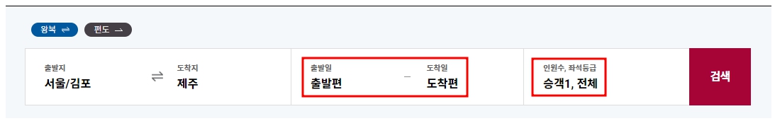 출발지와 도착지, 출발일과 도착일, 인원수, 좌석등급을 입력 후 검색 버튼을 클릭합니다.