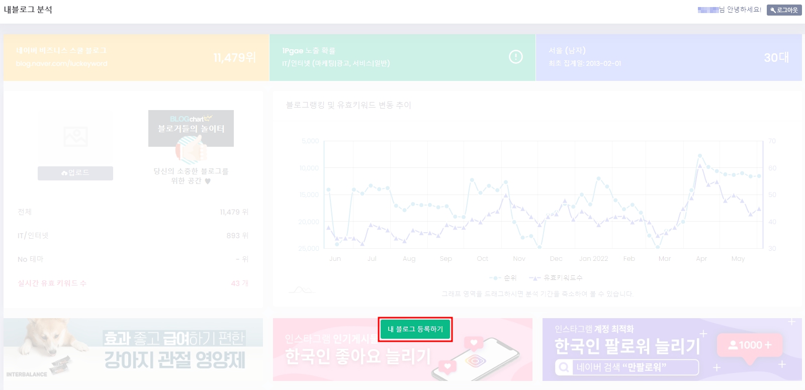 로그인 완료 후, 내 블로그를 블로그 차트에 등록해야 합니다.