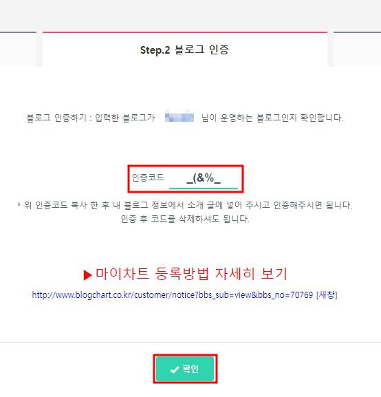 블로그 차트에서 부여한 인증코드를 블로그설명 란에 입력 및 저장 후, 블로그 차트 인증페이지에서 확인을 클릭합니다.
