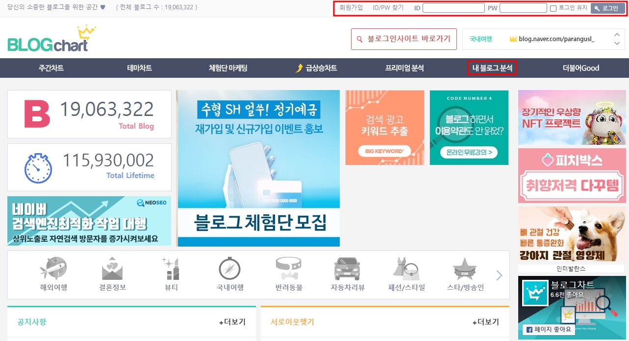 '블로그 차트'라는 사이트를 이용하면 블로그 순위를 알 수 있습니다.