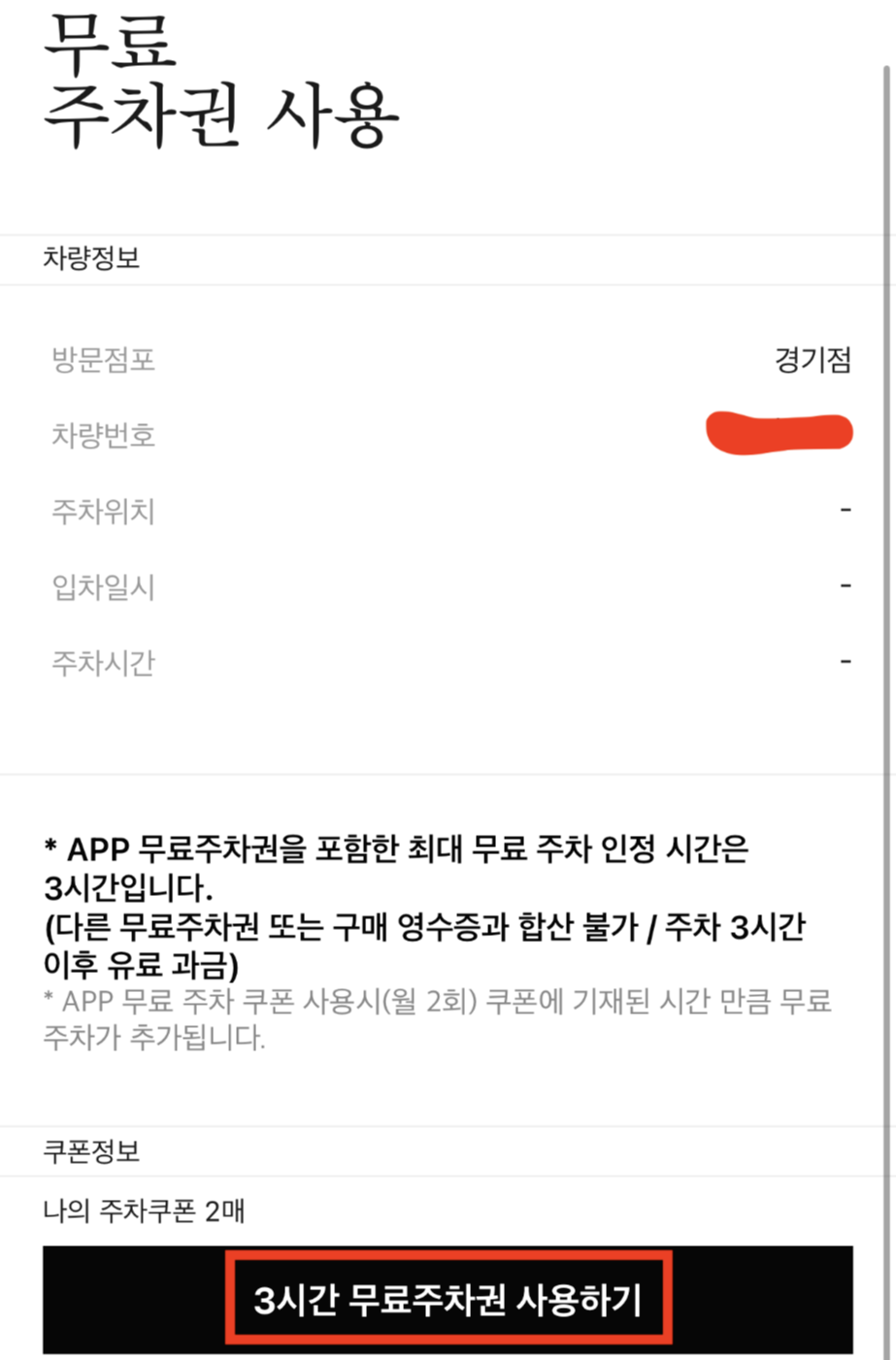 다음단계로 넘어가서 무료주차쿠폰 사용에 대한 정보가 일치하는지 확인 후 '3시간 무료주차 쿠폰 사용하기'를 클릭하면 됩니다.