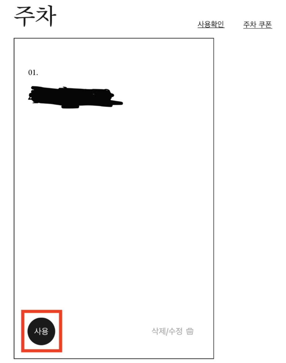 '주차쿠폰 사용'을 클릭하여 이용할 점포를 선택합니다.