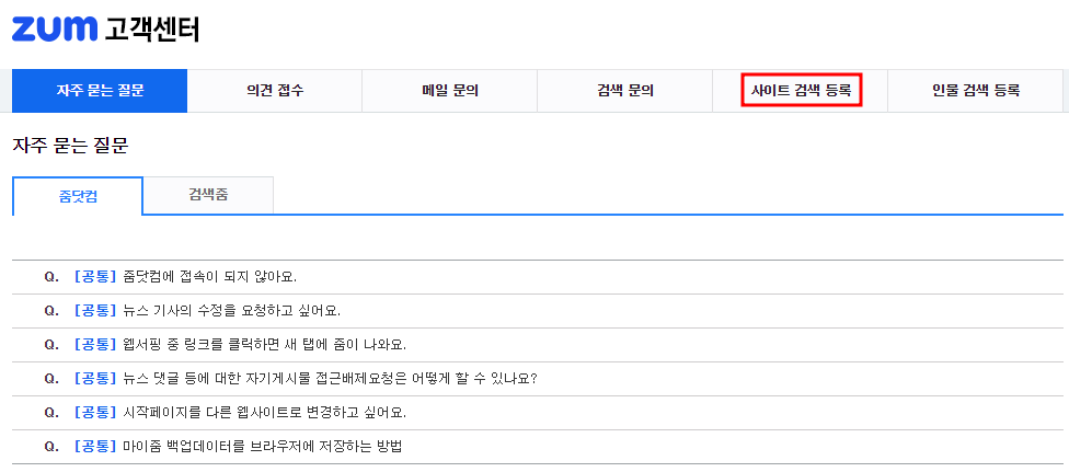 줌 고객센터에 접속하신 뒤, 우측 상단에 '사이트 검색 등록'을 클릭합니다.