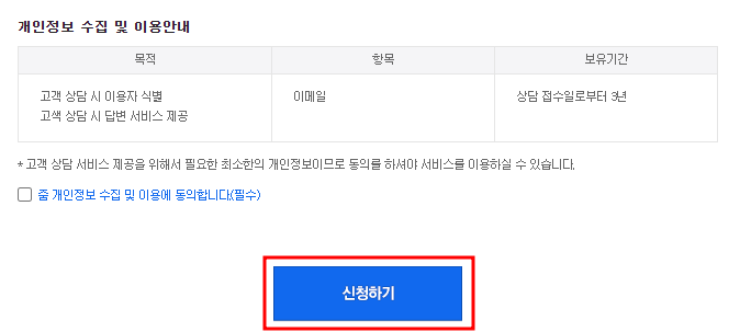 모든 기입란에 블로그의 정보를 입력 후, 하단에 개인정보 수집 및 이용안내의 수집동의를 확인 후 신청하기를 클릭하시면 됩니다.