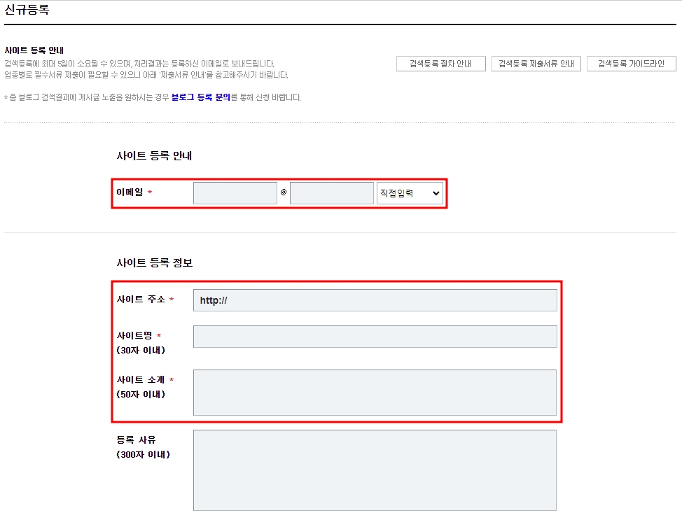 이메일, 사이트 주소, 사이트 명, 사이트 소개 를 필수적으로 입력해야 합니다.